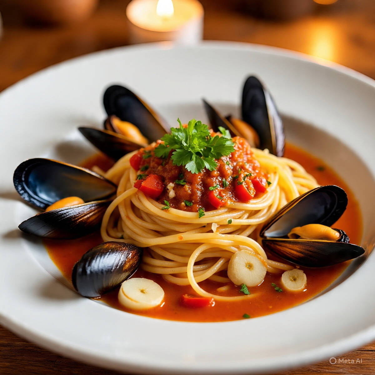 Spaguetti con mejillones en aceite de olivo, flameados en brandy y salsa de jitomate.