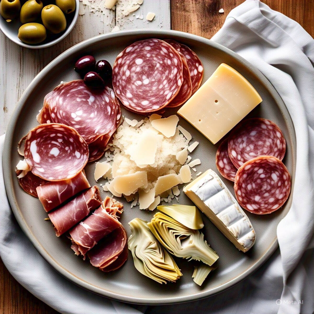 Parmesano fresco con jamón serrano, salami, queso y corazón de alcachofa.