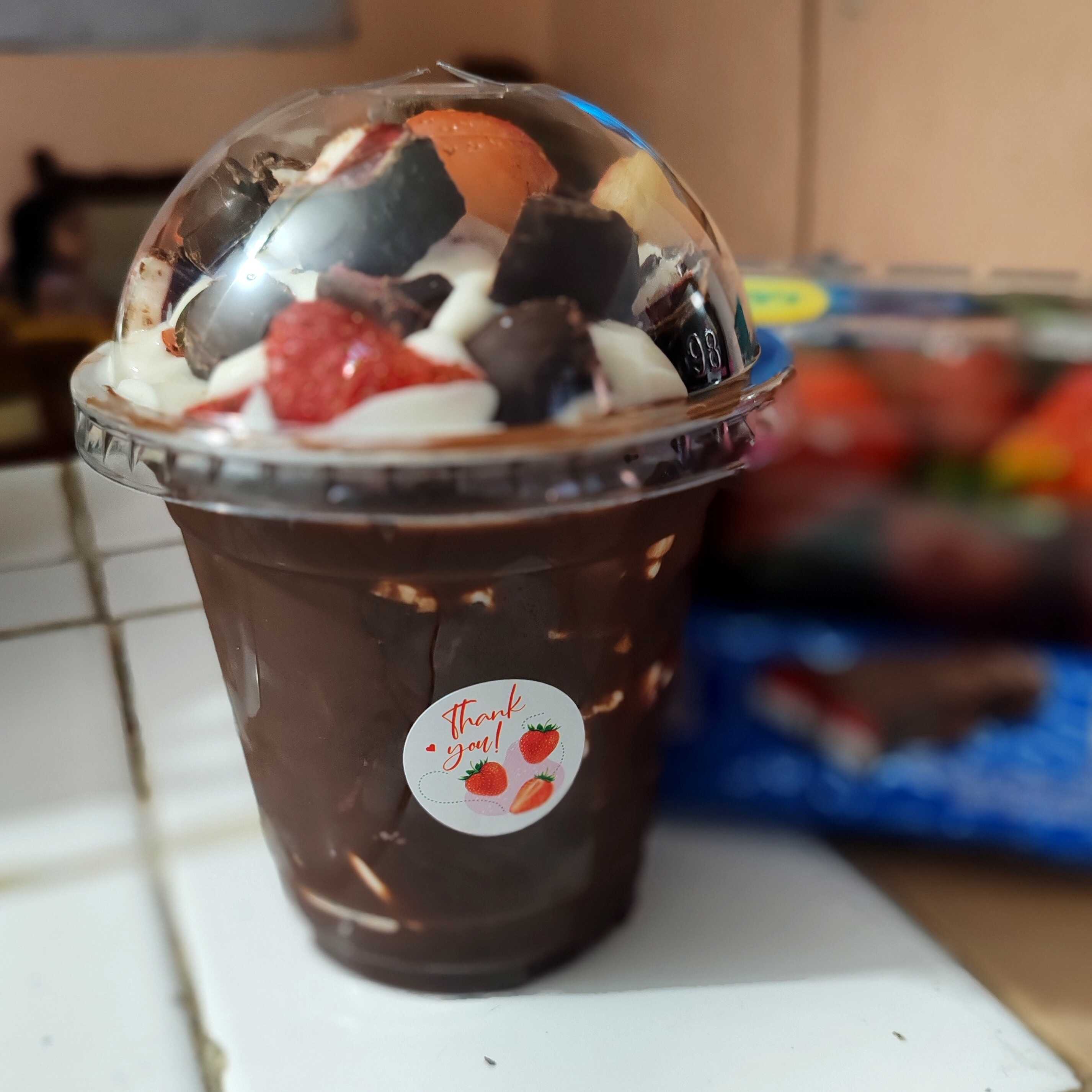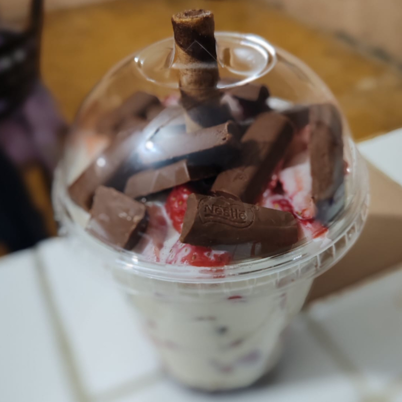 Vaso de 12oz, base de mermelada de fresa, fresas naturales desinfectadas, deliciosa crema casera y chocolates cremino
