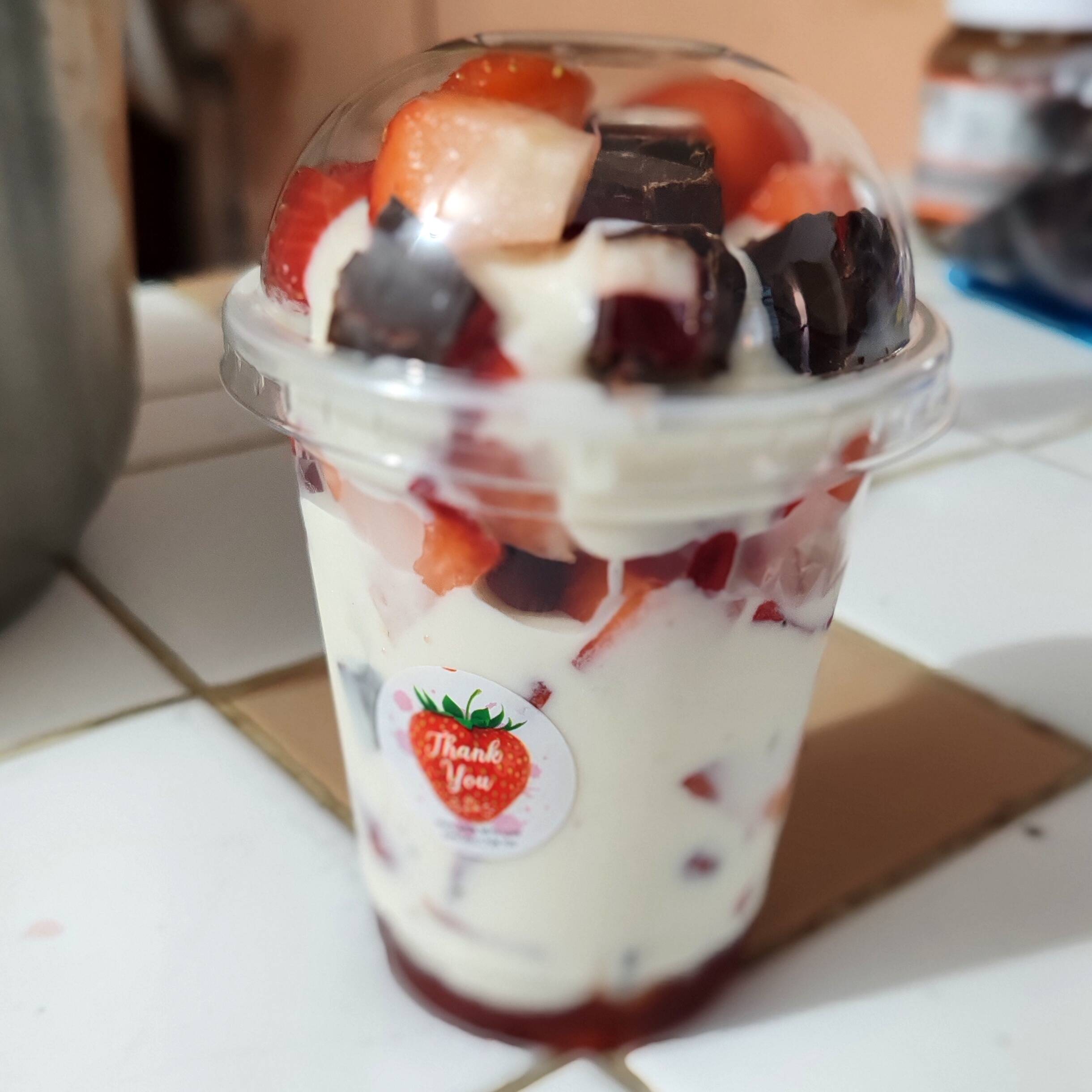 Vaso de 12oz, base de mermelada de fresa, fresas desinfectadas y picadas bañadas en una deliciosa crema casera