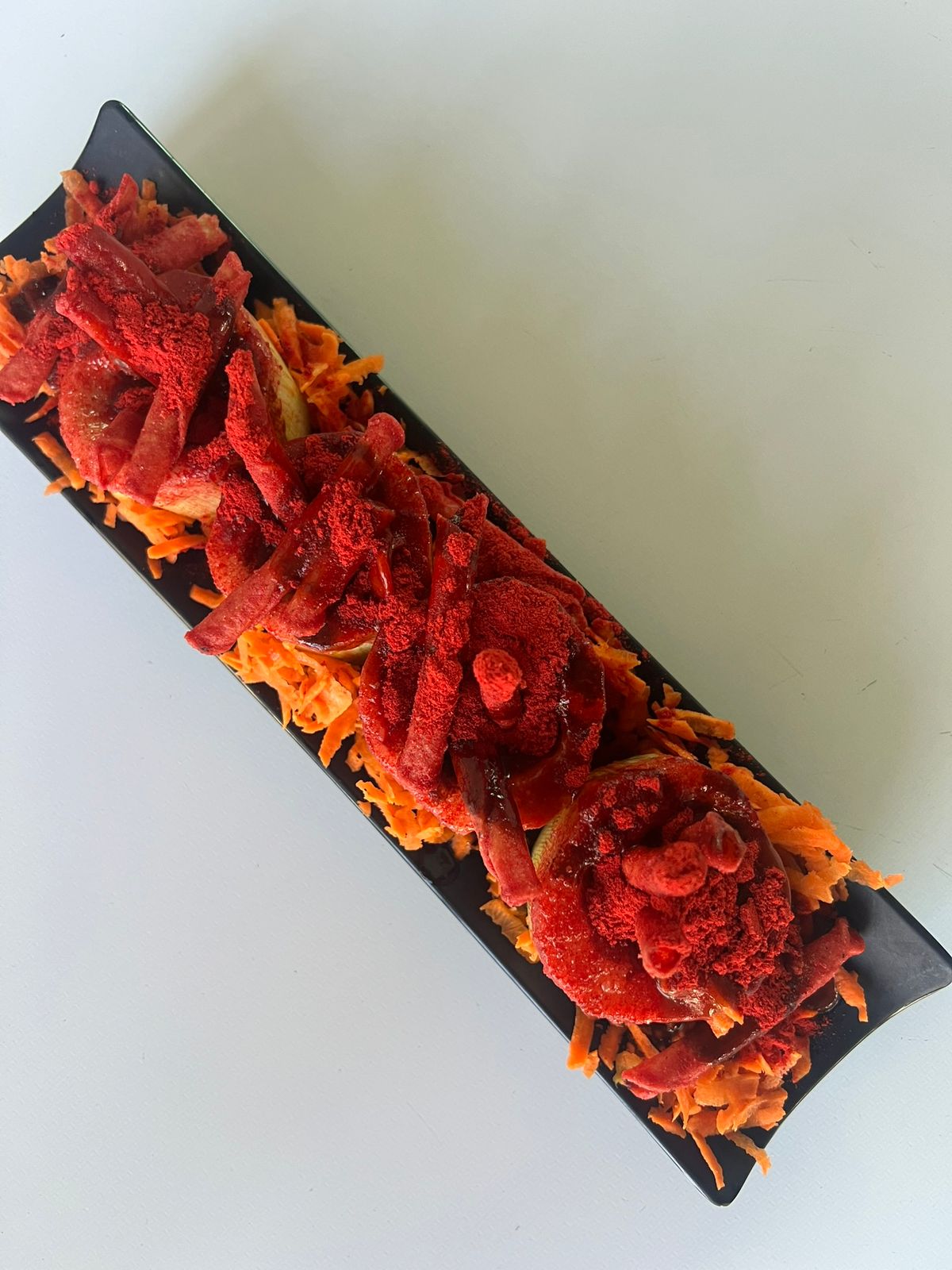 Pepino escarchado sobre una cama de fruta rayada, takis fuego, cacahuates, polvo de takis y mix de salsa.