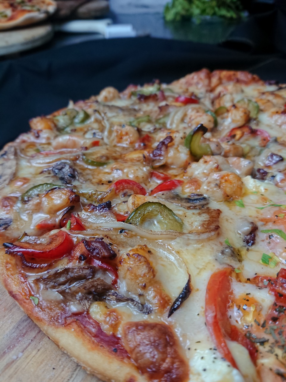 Camarón, tocino, champiñones, pimientos y cebolla.