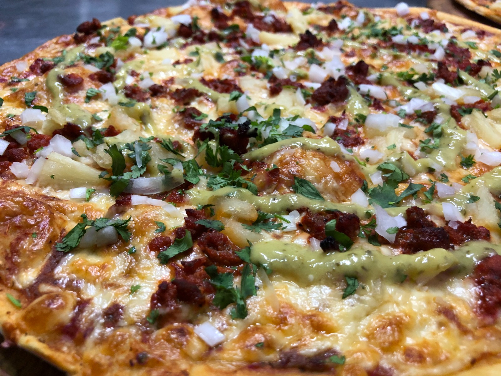 Pizza con carne al pastor, piña y cilantro.