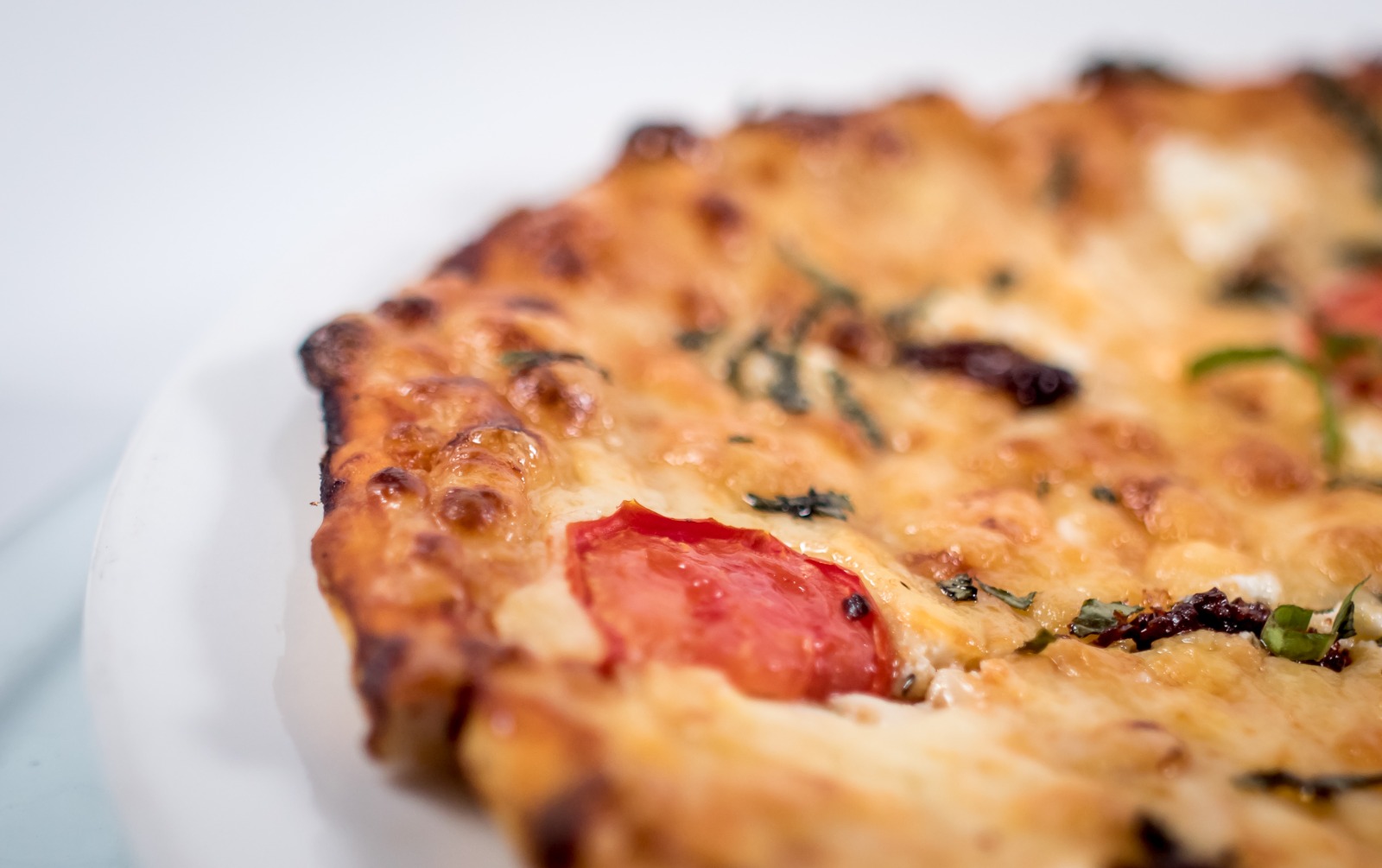 Salsa pesto, queso chihuahua, queso de cabra y tomate deshidratado.