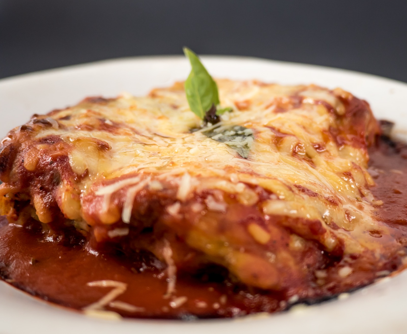 Lasagna rellena de carne molida y salsa marinara.