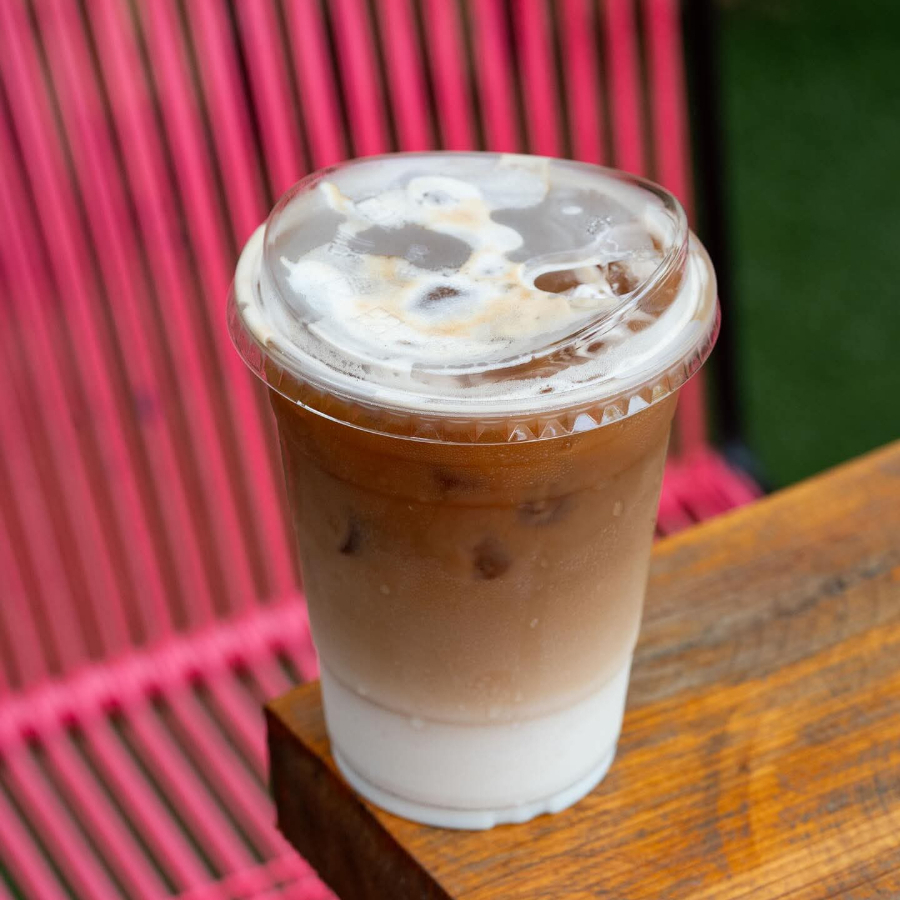 Un delicioso latte con un toque de caramelo, servido sobre hielo para una bebida fría y deliciosa.