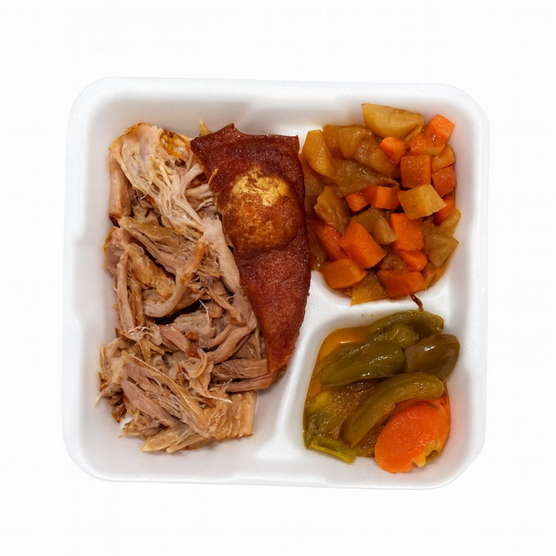 Platillos de carne horneada acompañado de papa, zanahoria y chiles en vinagre