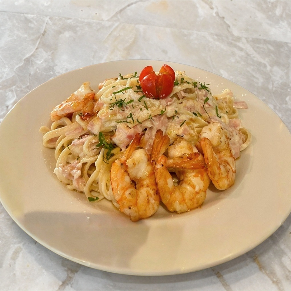 Pasta fetuccini bañada en salsa de la casa con jamón y queso parmesano.