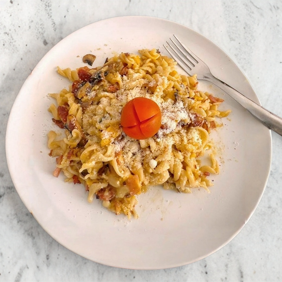 pasta fusilli, bañada con salsa de la casa con jamón, champiñon y tocino.