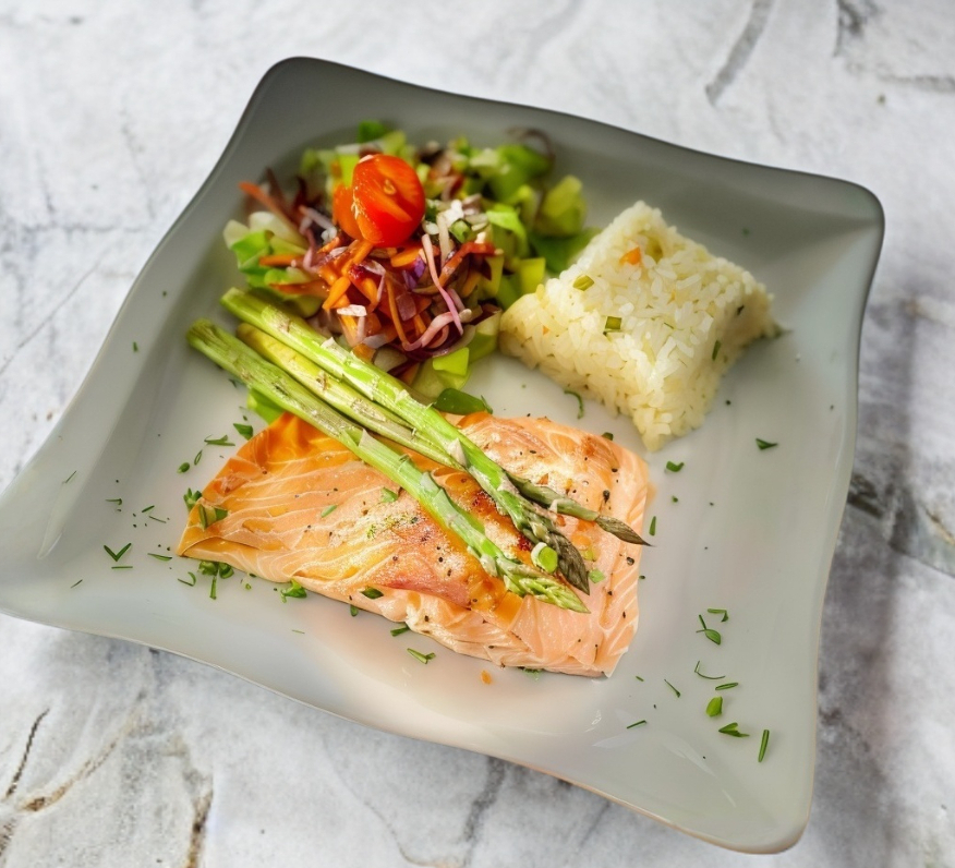 250 gr. de salmón condimentado a la plancha, acompañado con verduras al vapor y pure de papa.