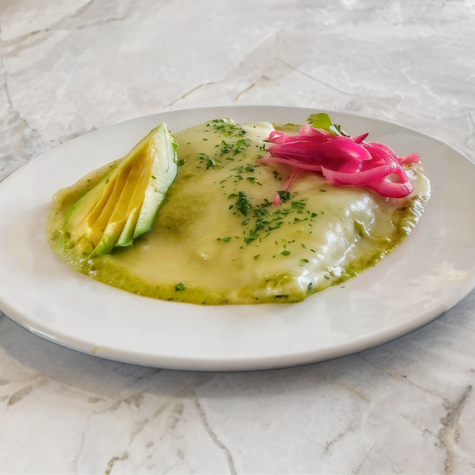 4 piezas de tortilla con pollo baadas en salsa verde cremosa con chile poblano y queso gouda gratinado.