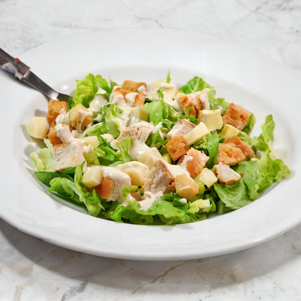 Lechuga romana con pollo a la plancha, queso parmesano y crutones.