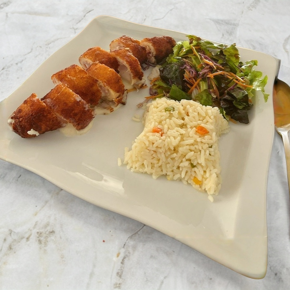 Pechuga rellena con queso mozzarella y jamon, empanizada y acompañada con arroz y ensalada de la casa.