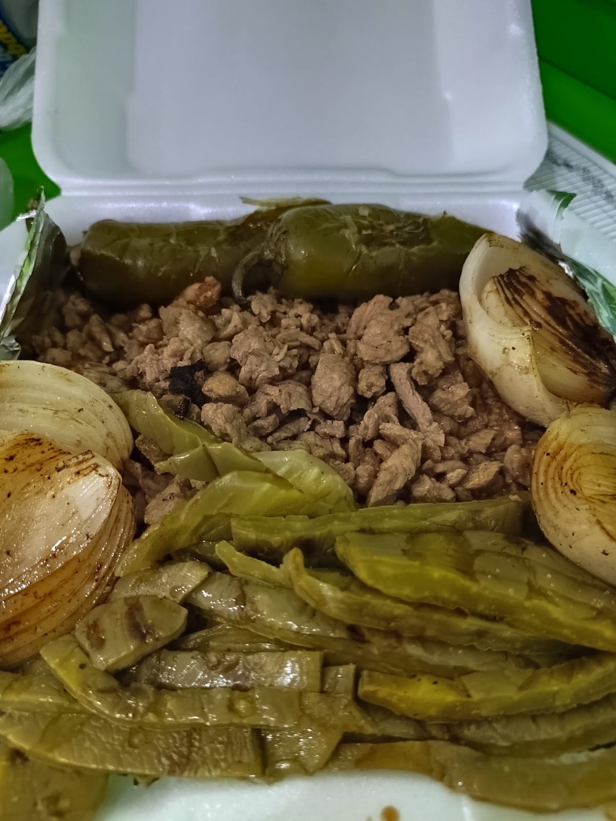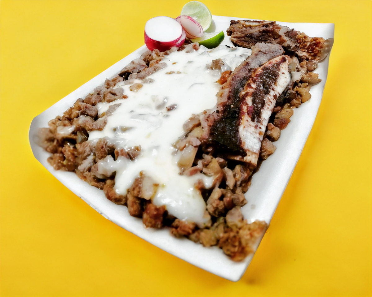 Pastor, bistec, jamón, tocino, cebolla y queso.