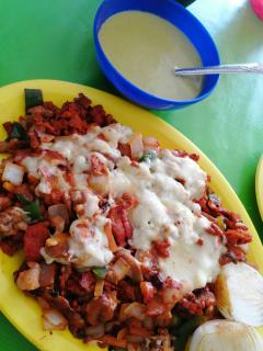 Queso fundido con chorizo dorado.
