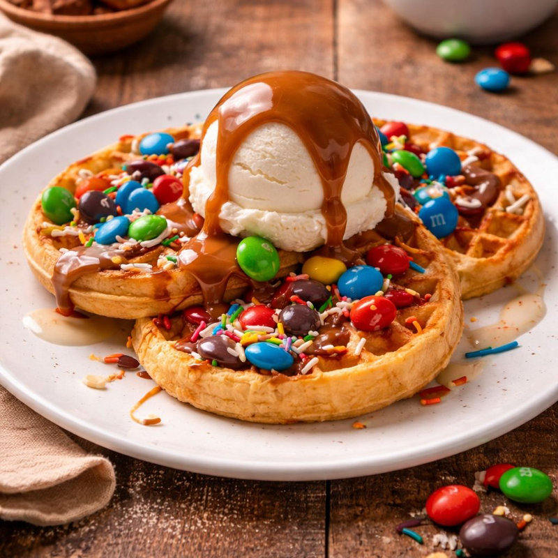 3 waffles de receta secreta REYDI con chocolates M&M’S y cajeta; acompañados de chispas de sabores, bañados con lechera y servidos con una porción de delicioso helado de vainilla