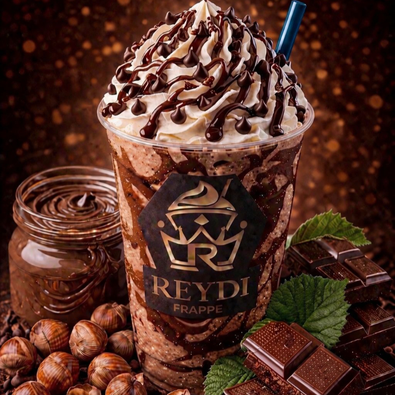 Frappé 16oz de avellana receta secreta REYDI; bañado con chocolate líquido, granillo de chocolate y chispas de chocolate