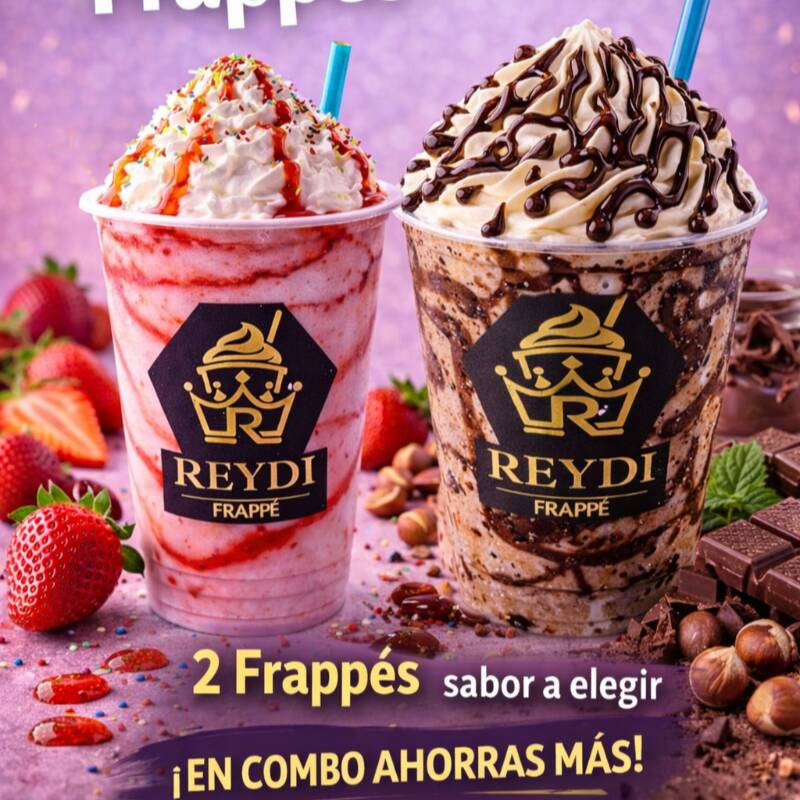 Frappé 16 oz de fresa hecho con la receta secreta REYDI; bañado en jarabe de fresa y chispas de sabores
