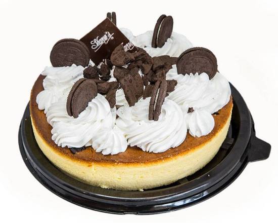 Pastel de queso philadephia y relleno de galleta oreo, base de pan de chocolate y decoración de crema batida y galleta oreo. 6-8 Pociones.