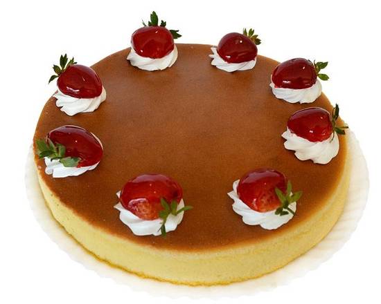 Pastel con relleno de flan napolitano y pastel de queso, cubierto con hojuelas de hojaldre fresas glaseadas y 3 rollos de chocolate blanco. 8-9 Pociones.