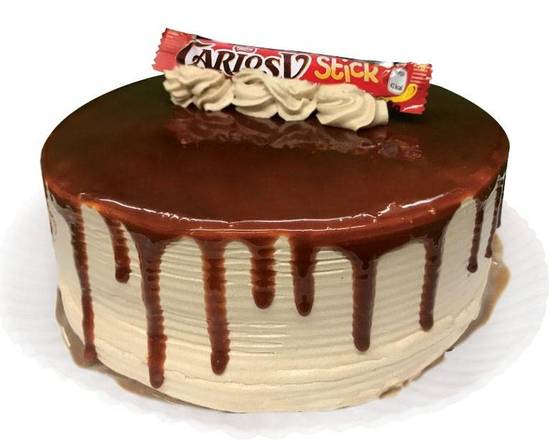 Pastel esponjoso bañado en leche de café cubierto con crema chantilly y decorado con chocolate liquido 10-15 Pociones.