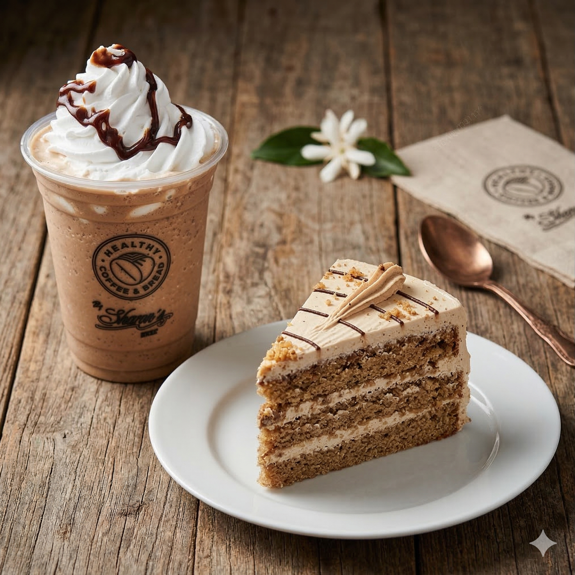 2 Rebanadas de pastel Mocka + 2 Bebidas Calientes