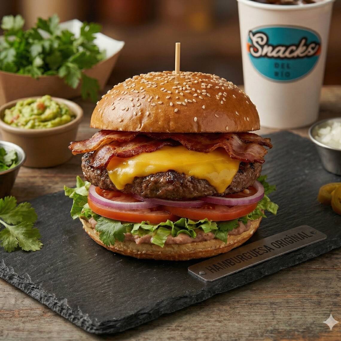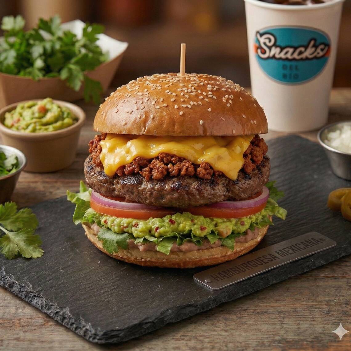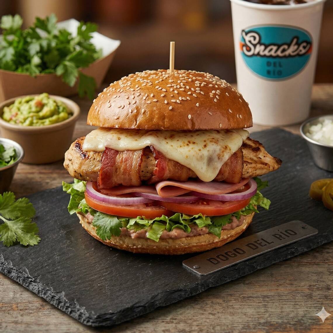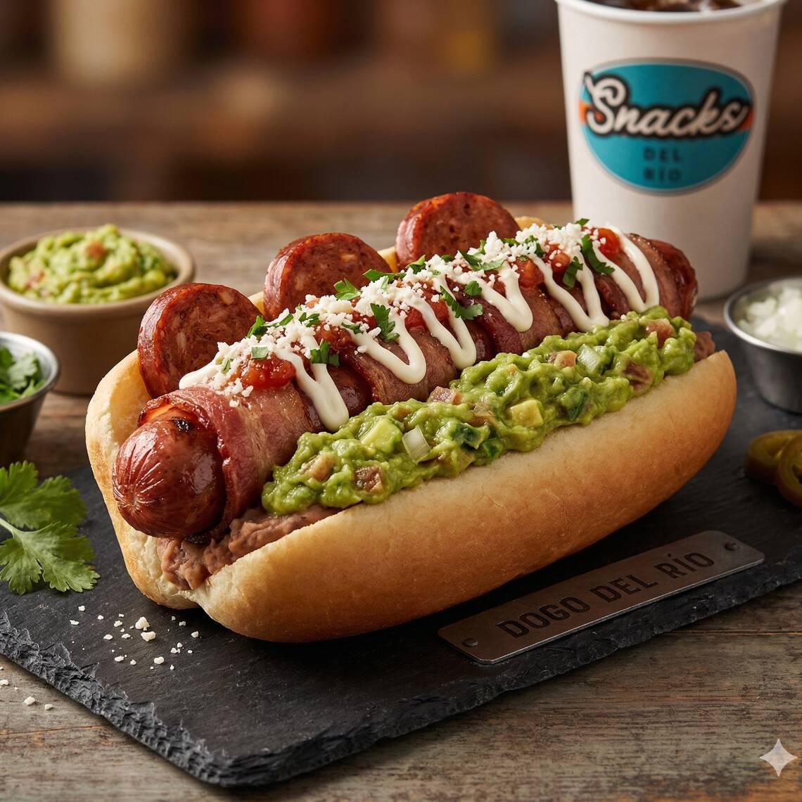 Salchicha sobre pan de hot dog, combinada con trozos de tocino, queso Oaxaca cebolla, jitomate y champiñones