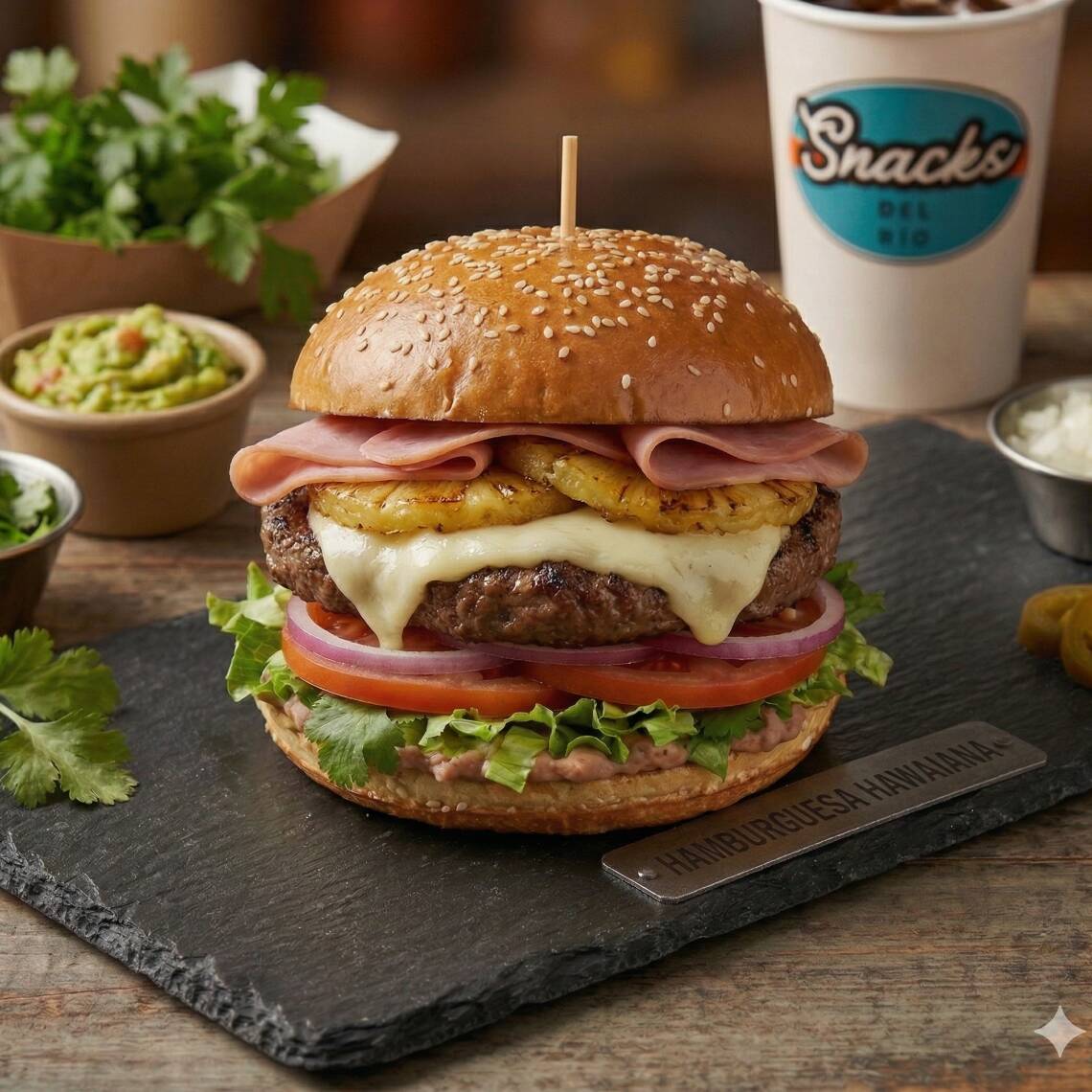 Deliciosa salchicha combinada con trozos de tocino, jamón, cebolla, jitomate y piña asada.