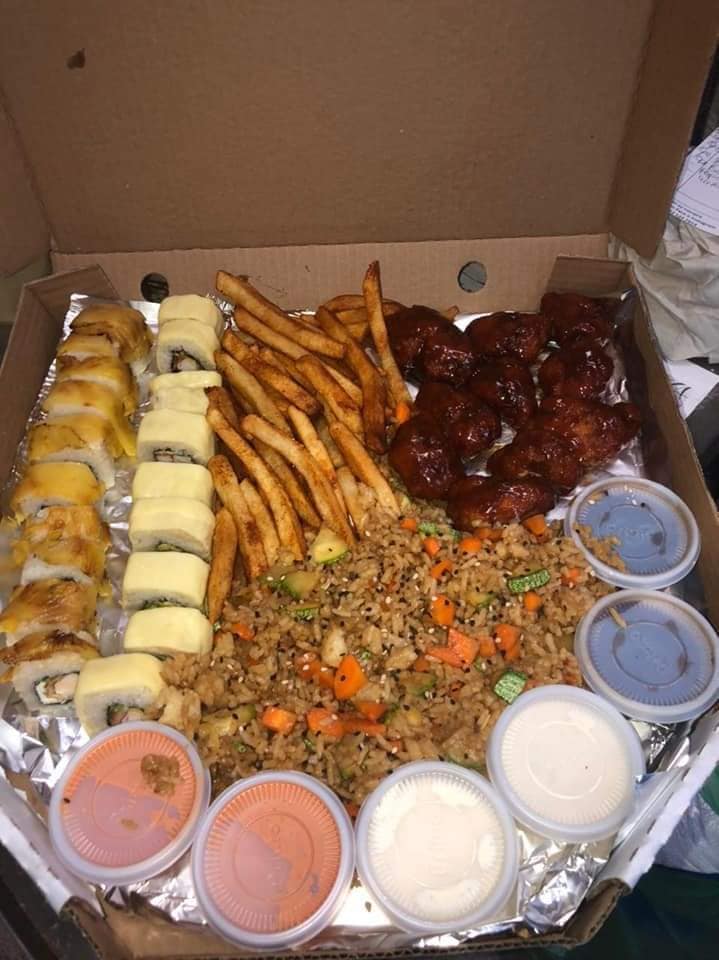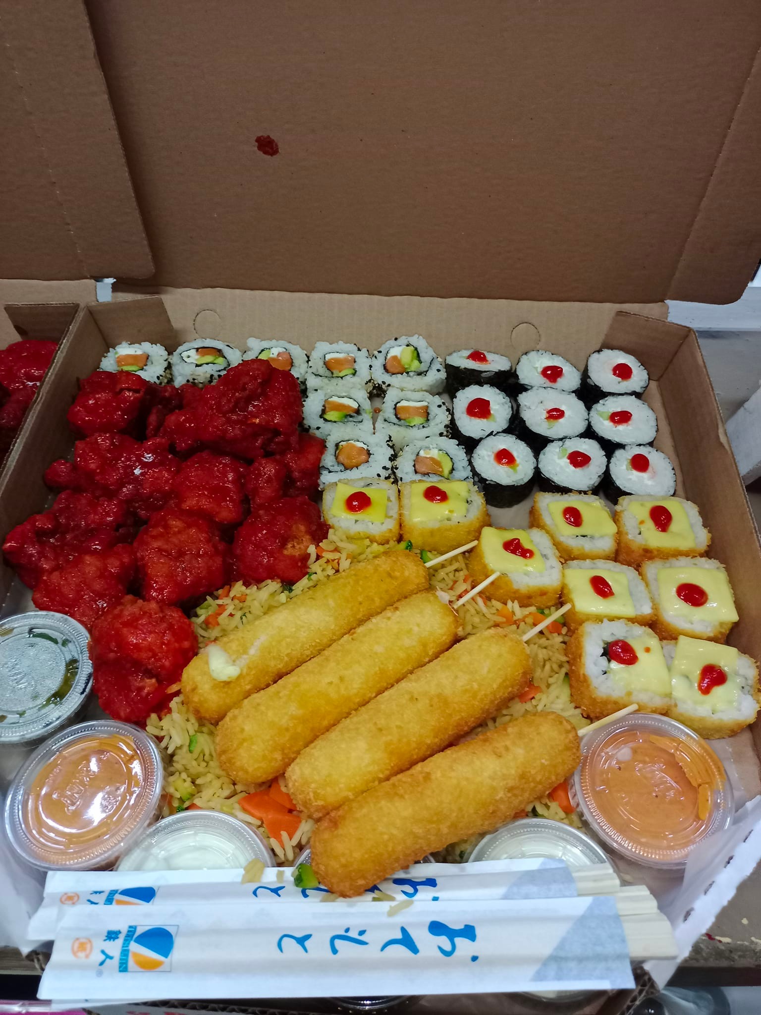 2 rollos a elegir, yakimeshi de verduras, 10 piezas de boneless y papas.