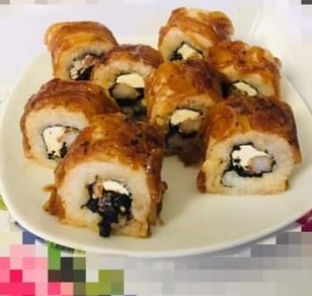 Arroz al vapor con masago, camarón empanizado, tampico, aguacate, cebollín, ajonjolí, salsa anguila y spicy mayo.