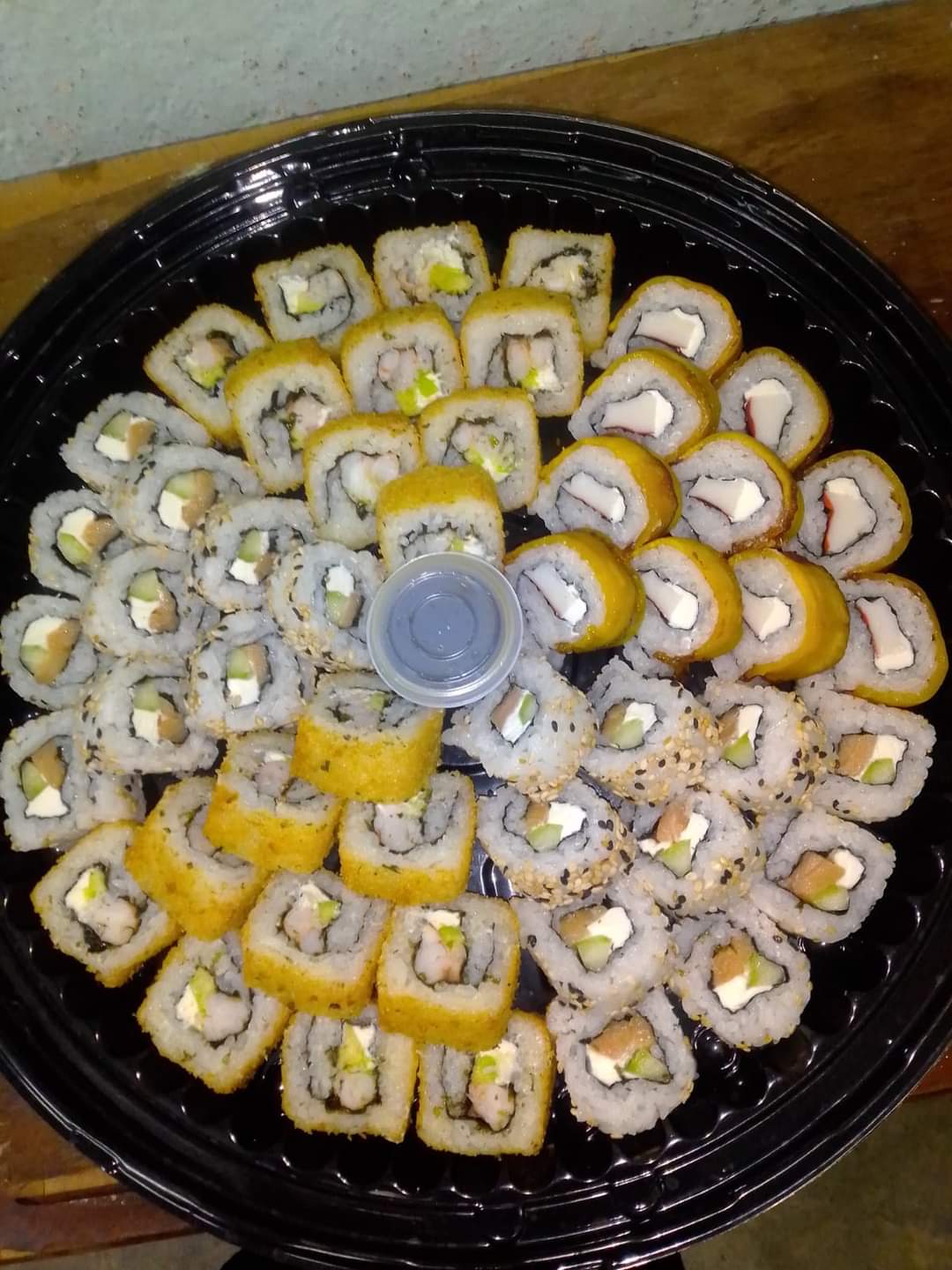 Contiene 3 rollos (30 pzas), 4 pzas de kushiague de queso o platano, yakimeshi de verduras y 12 piezas de boneless.