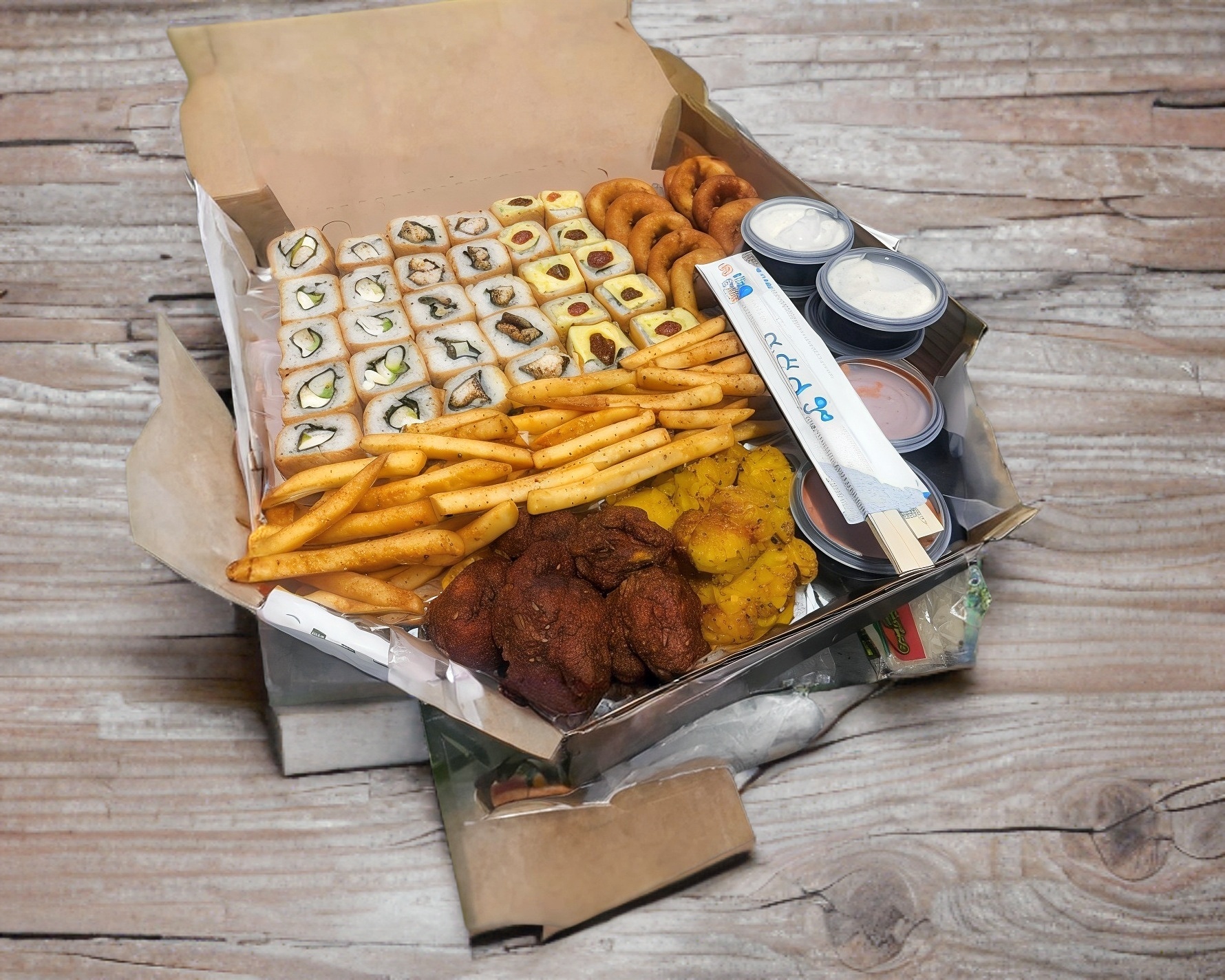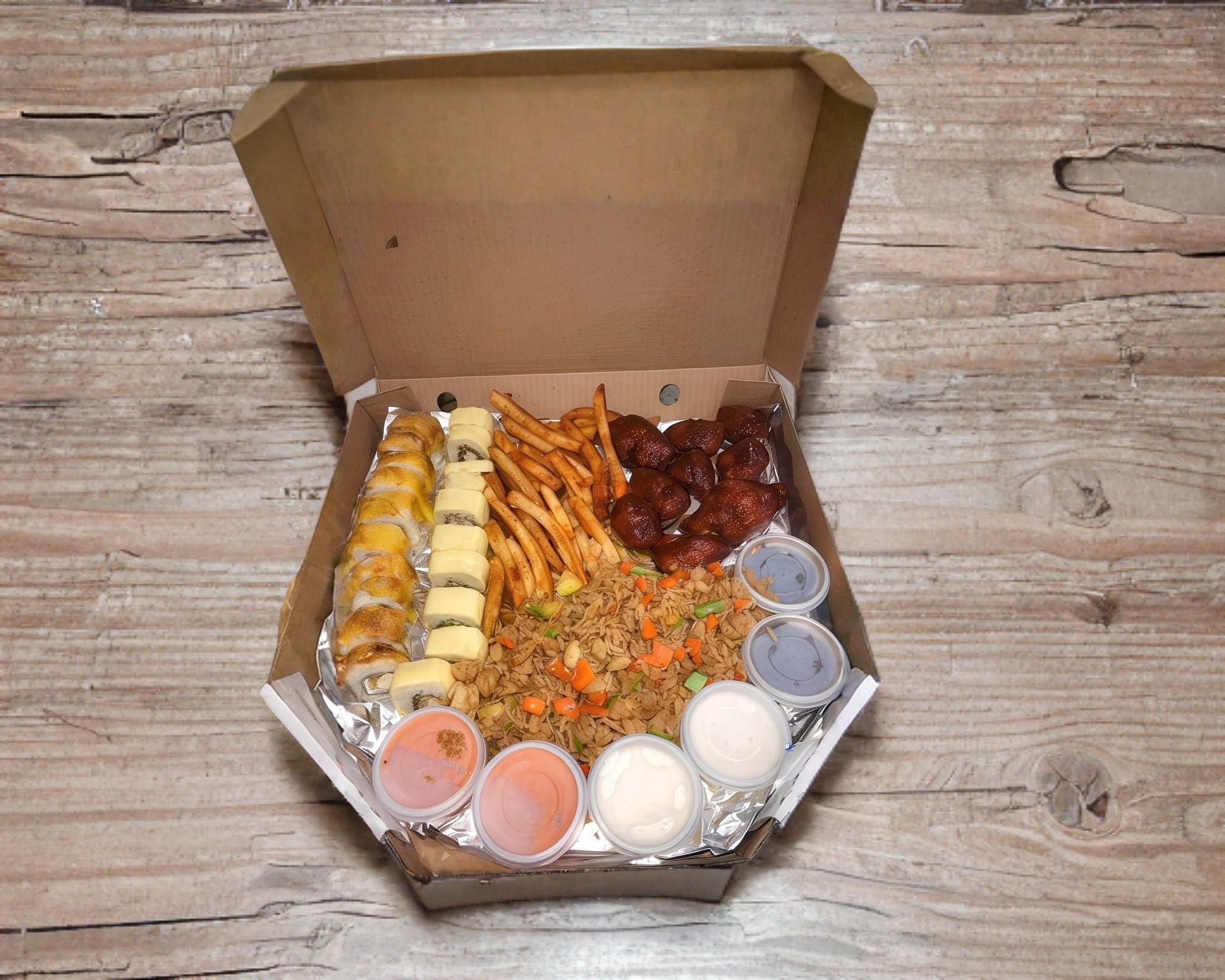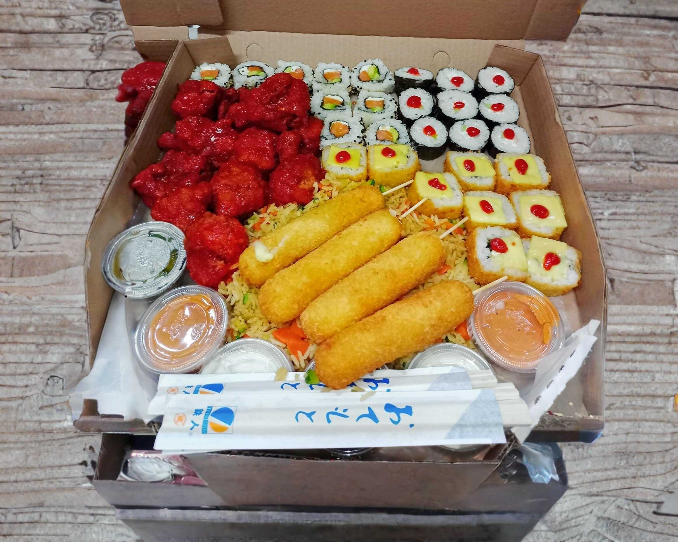 2 rollos a elegir, yakimeshi de verduras, 10 piezas de boneless y papas.