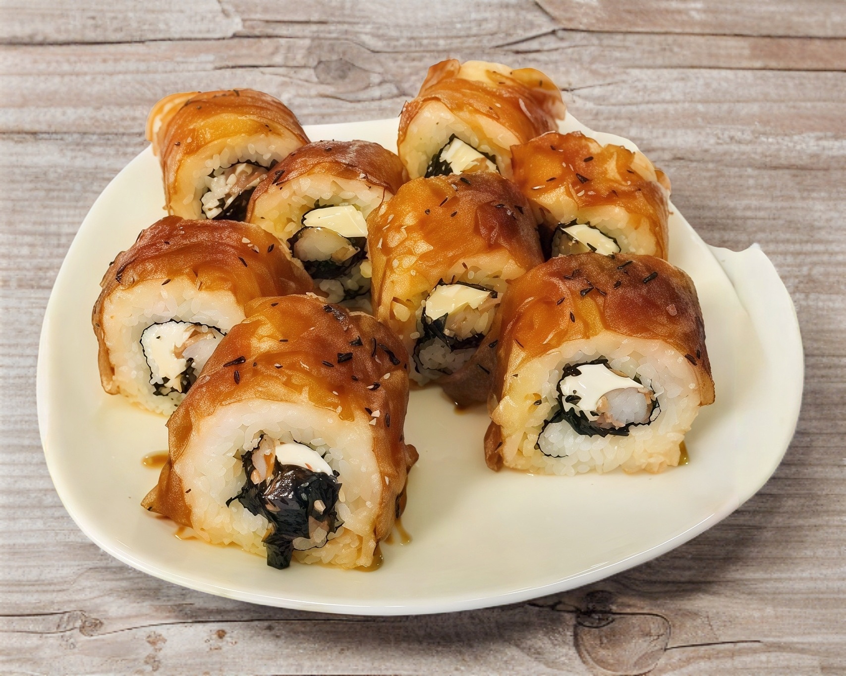Surimi y queso crema por dentro, con plátano frito con salsa de anguila por fuera.