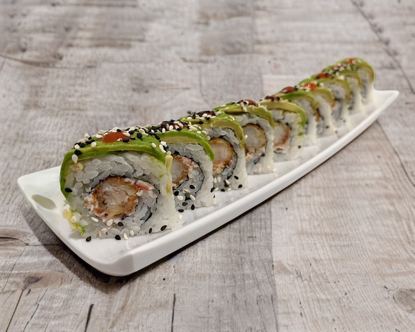Atún, salmón, camarón y pepino, alga tempura con tampico y ajonjolí.