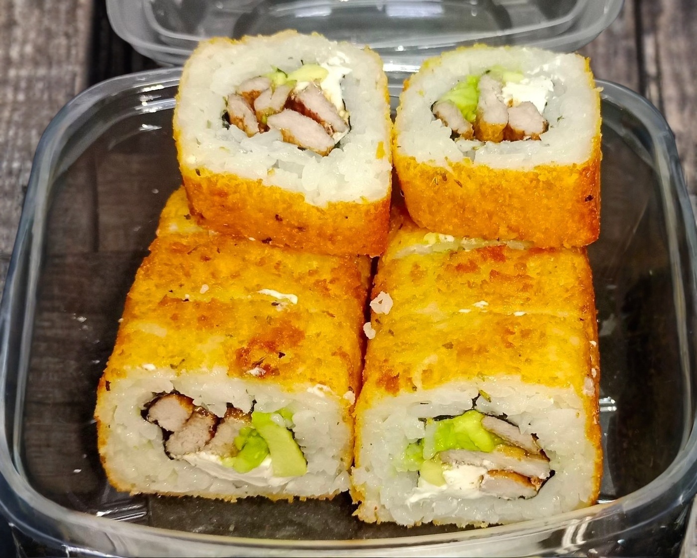 D. Camarón empanizado, pepino y aguacate. F. Empanizado y gratinado, tampico encima y bañado en salsa anguila y ajonjolí