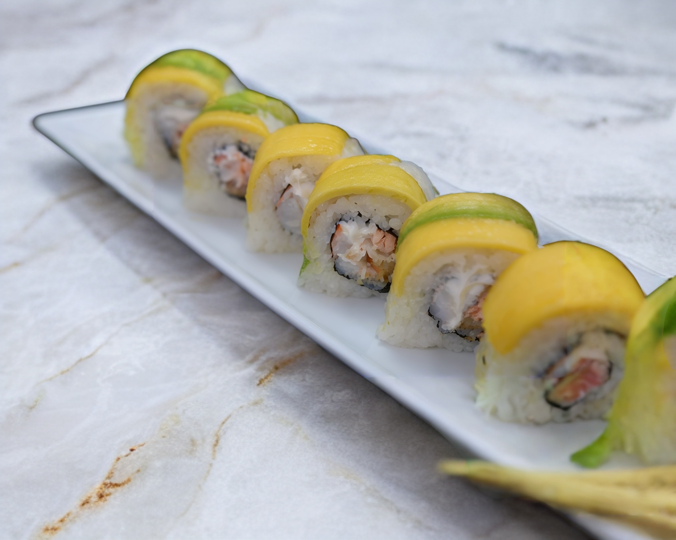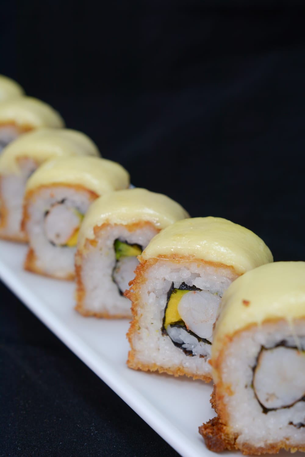 Relleno de salmón tempura, camarón, queso crema, cubierto con aguacate y mango.