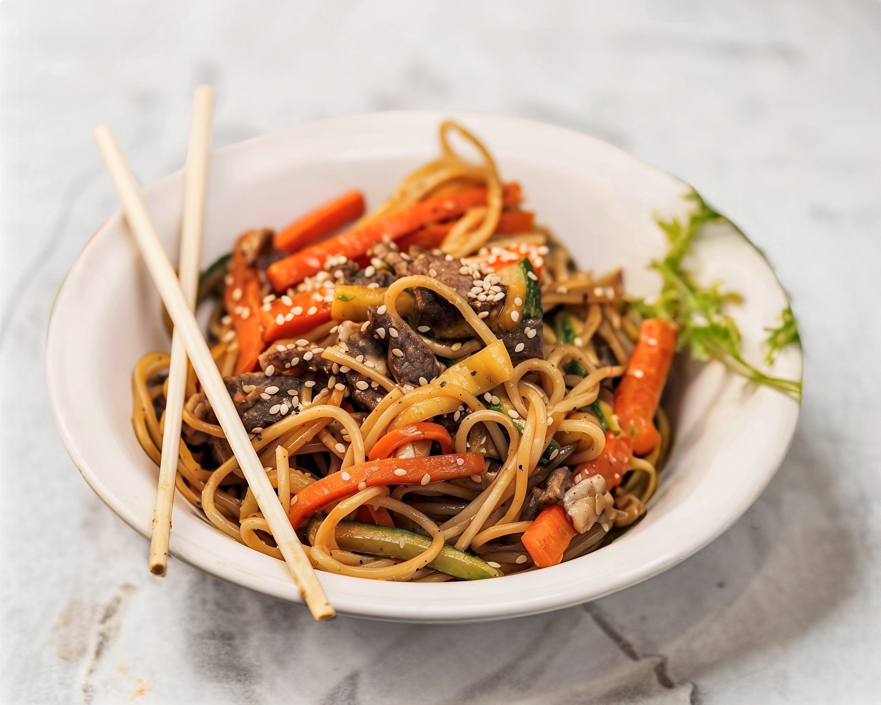 Pasta oriental con carne vegetales y teriyaki