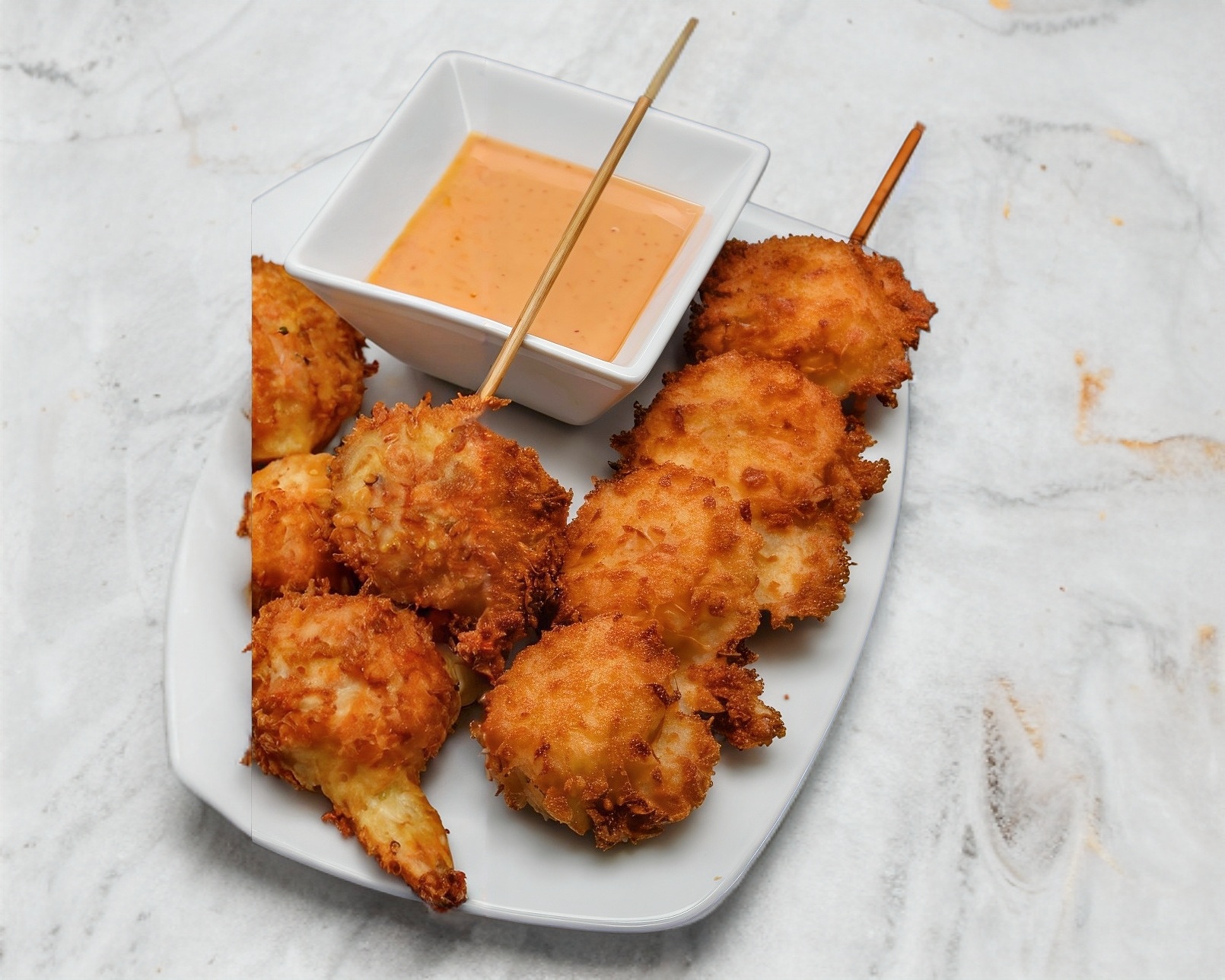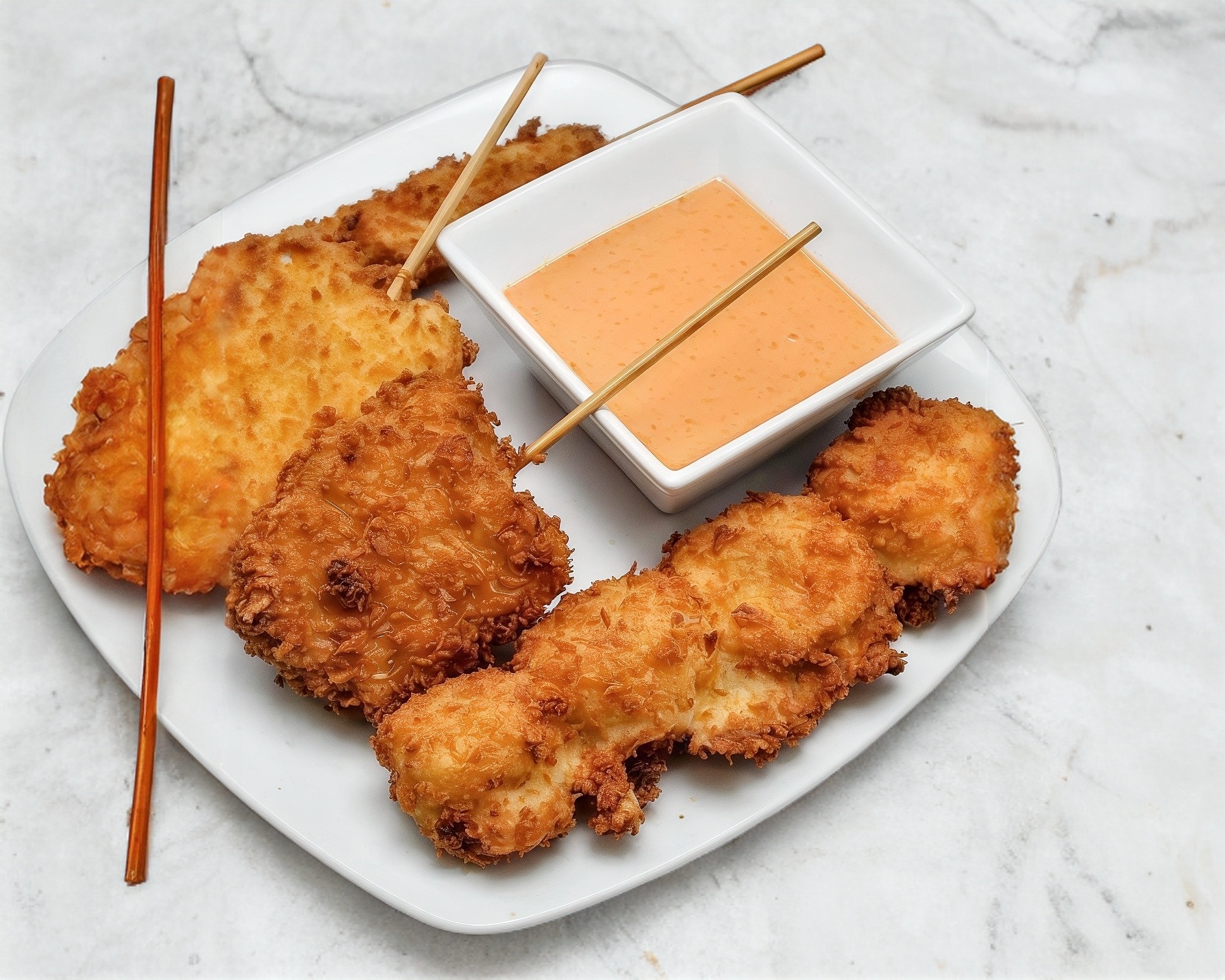 Relleno de atún, queso, aguacate, empanizado con panko y coco, bañado con una salsa de coco.