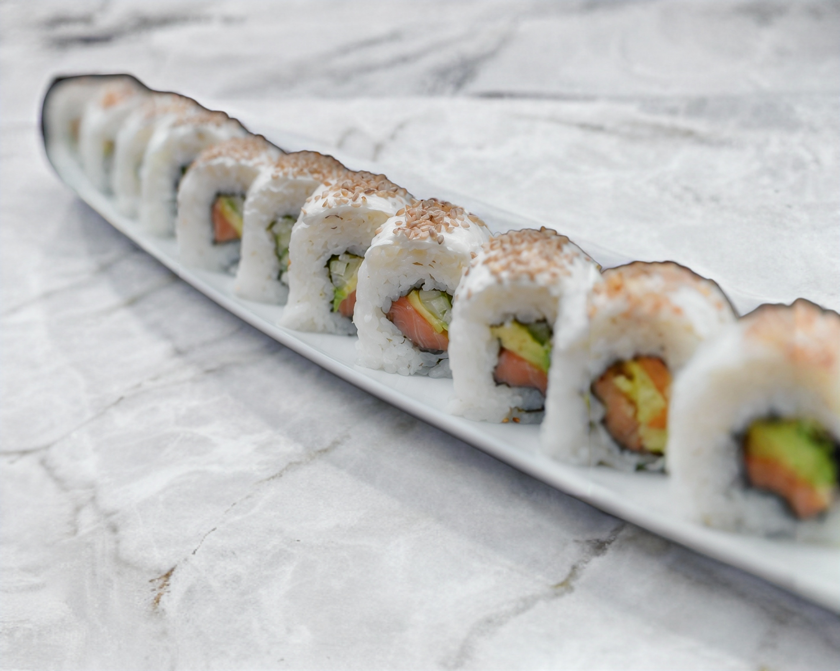 Relleno de pepino, aguacate, salmón cubierto de queso crema y ajonjolí, incluye soya preparada, aderezo de sriracha y chiles toreadas.
