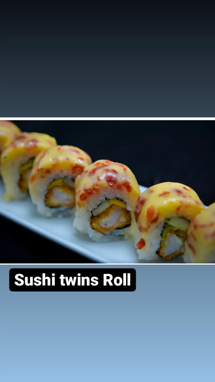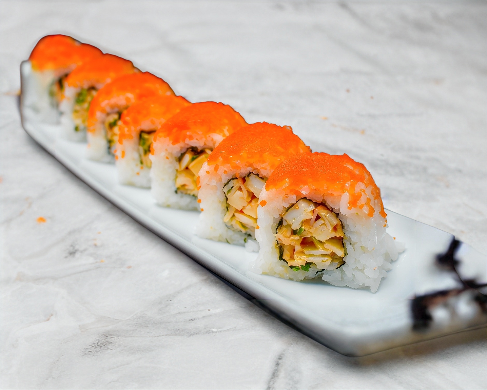 Relleno de surimi, mayonesa picante y cebollín, cubierto con hueva de pez volador, incluye soya preparada, aderezo de sriracha y chiles toreados.
