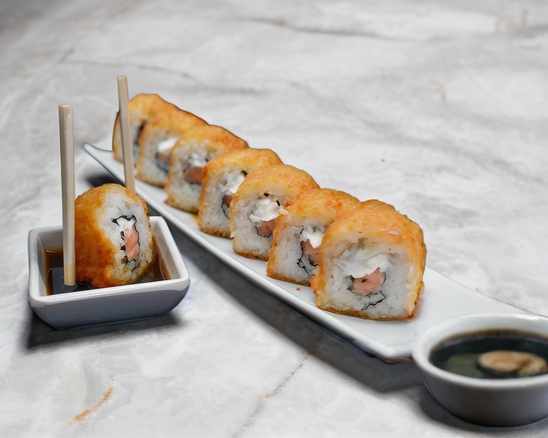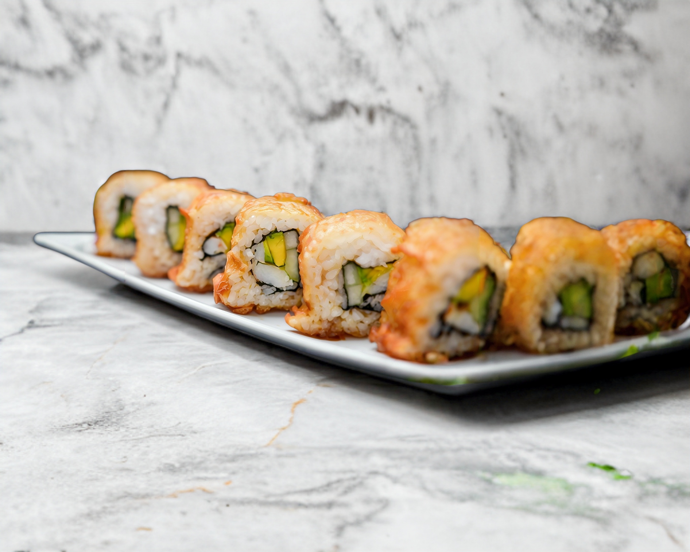 Relleno de salmón o camarón en tempura, pepino y aguacate, cubierto con ajonjolí, incluye soya preparada, aderezo de sriracha y chiles toreados.