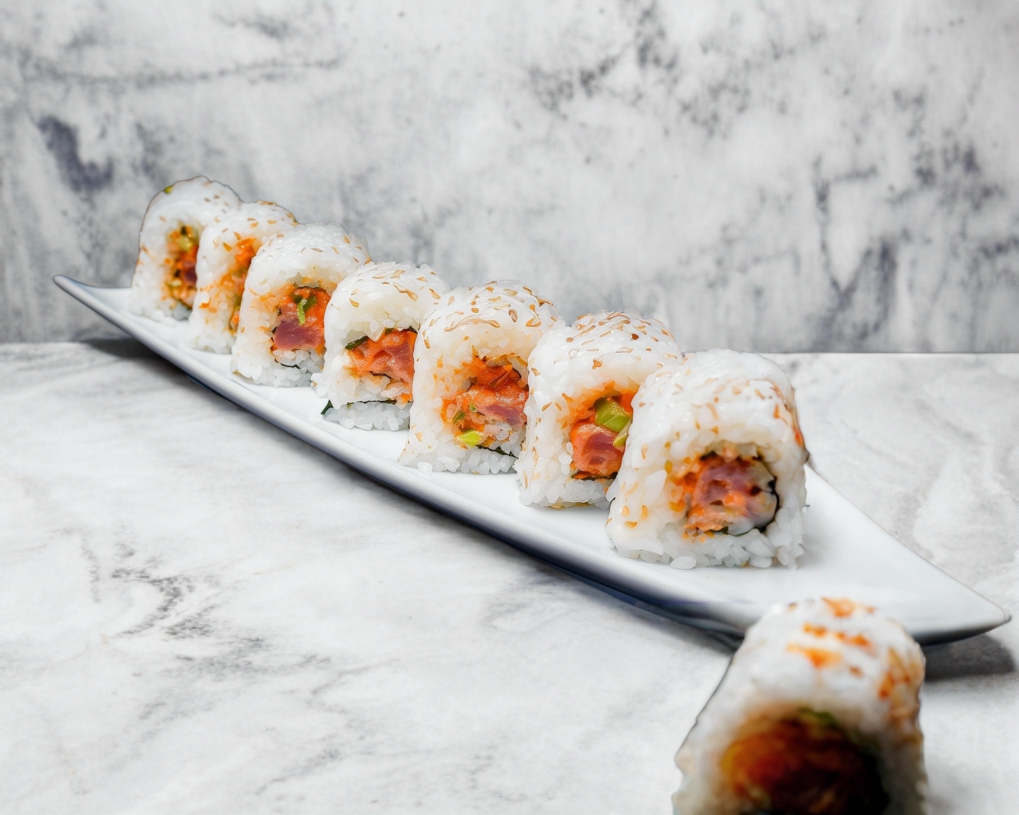 Relleno de atún, mayonesa picante y cebollín, cubierto con ajonjolí, incluye soya preparada...