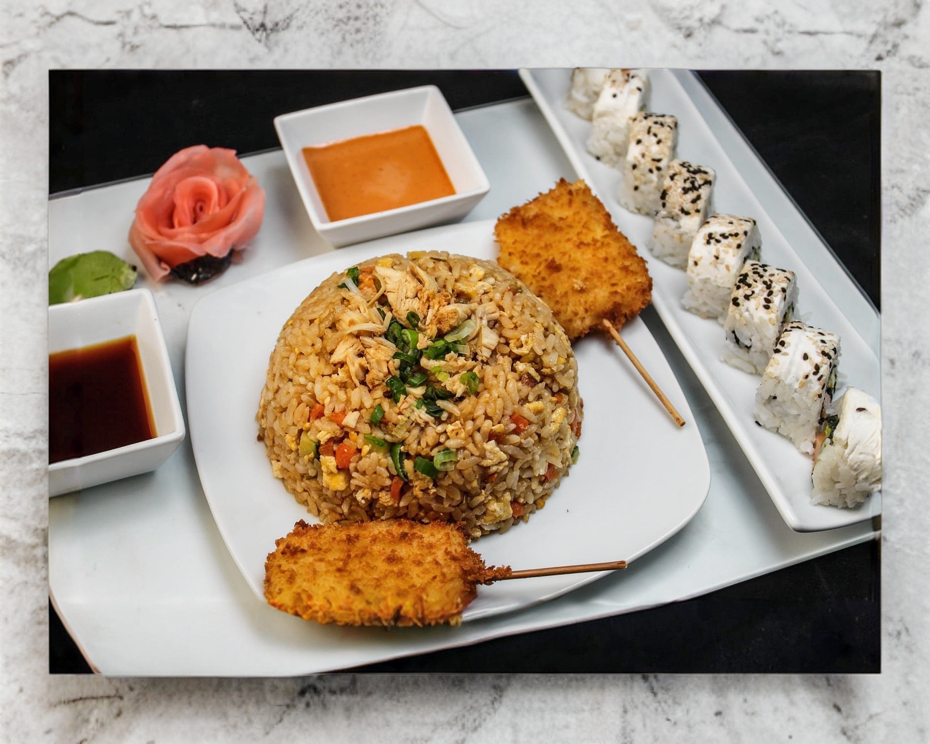 California Roll*1 + Kushiages de Queso*1 + Yakimeshi Mixto*1 + Agua Fresca Jamaica 500ml*1. Platillo para una persona.