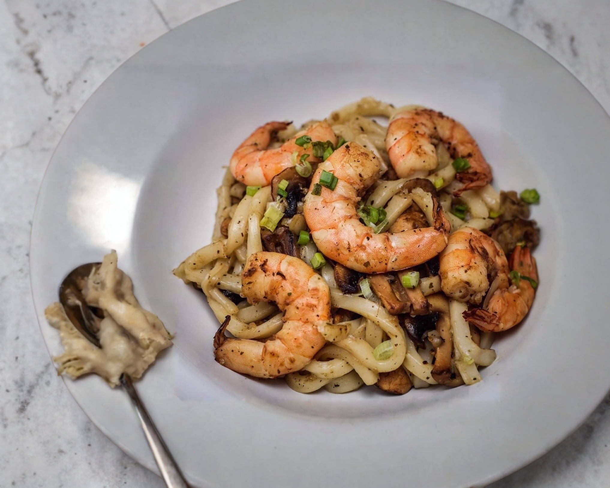 Udon, camarón, champiñón, cebolla y hierbas fina.