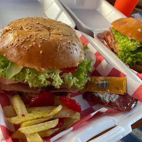 Carne de hamburguesa con piña tocino jitomate cebolla y papas francesa