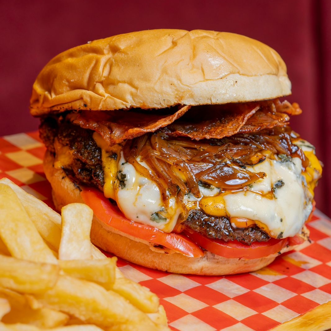 Carne de hamburguesa queso amarillo salchicha roja tocino cebolla tomate y papa francesa