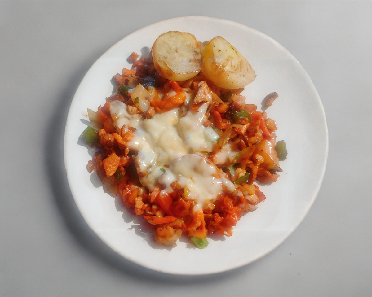 Bistec, chuleta, chorizo, tocino, cebolla, morrón, jitomate y queso.
