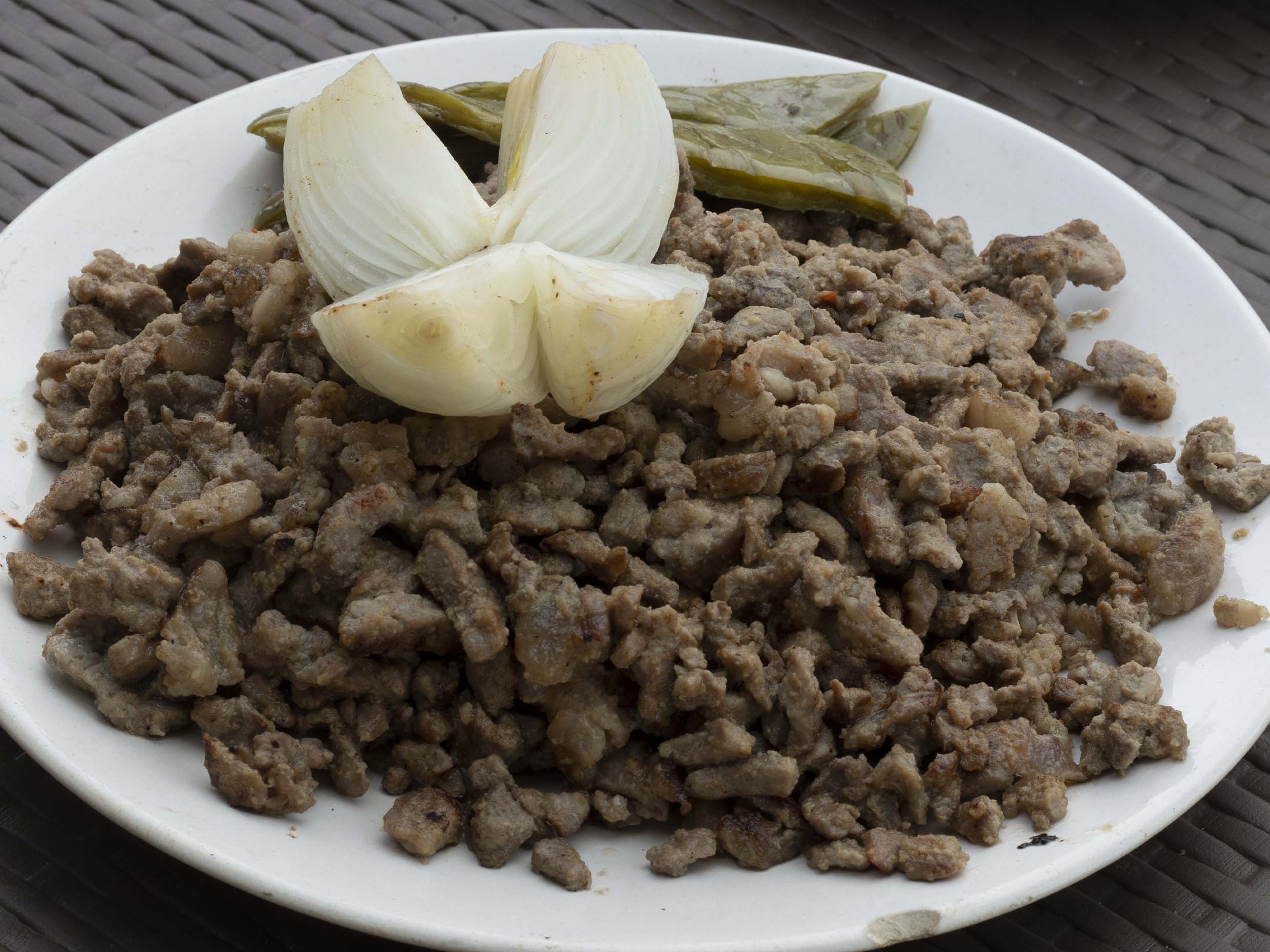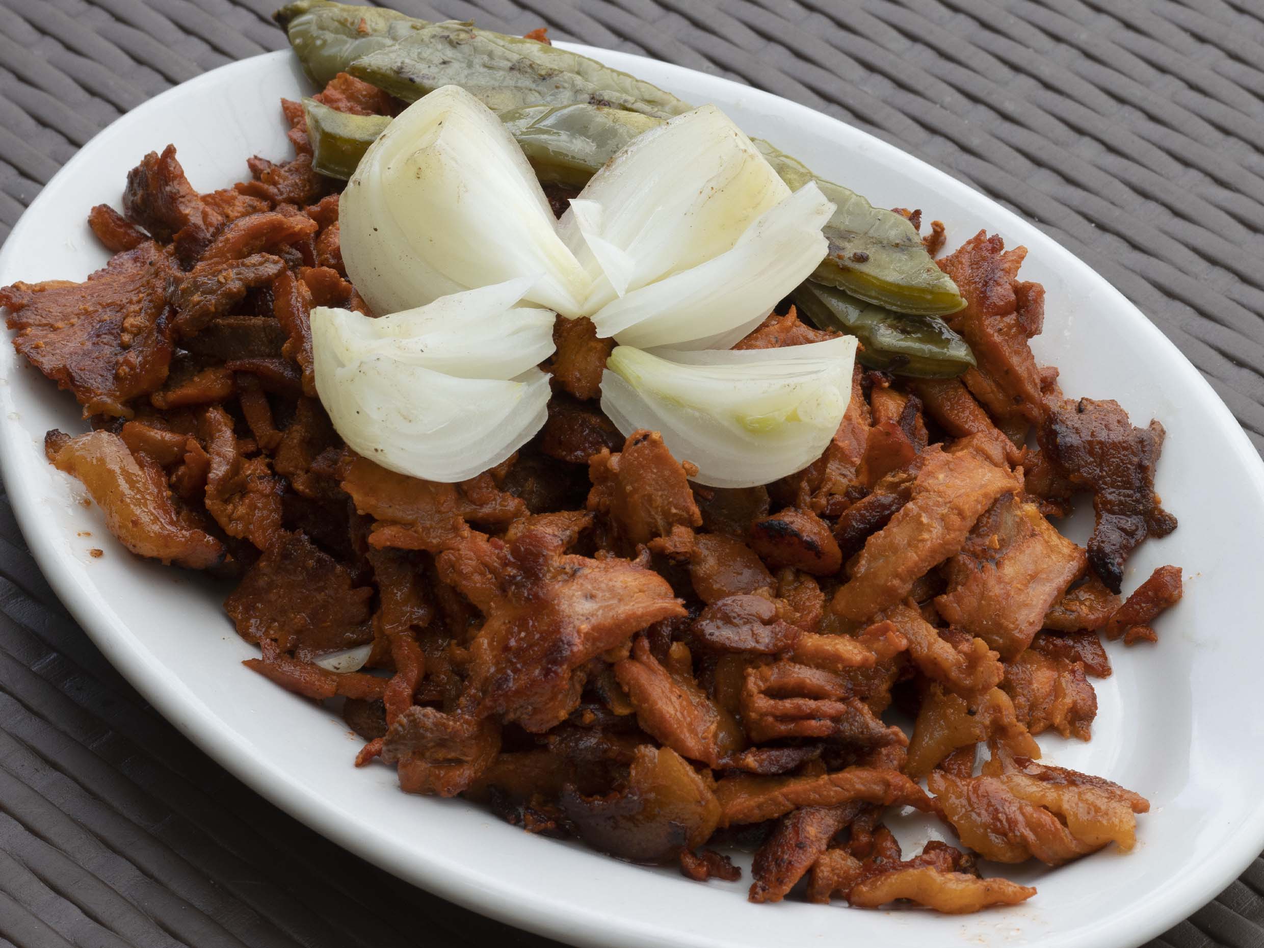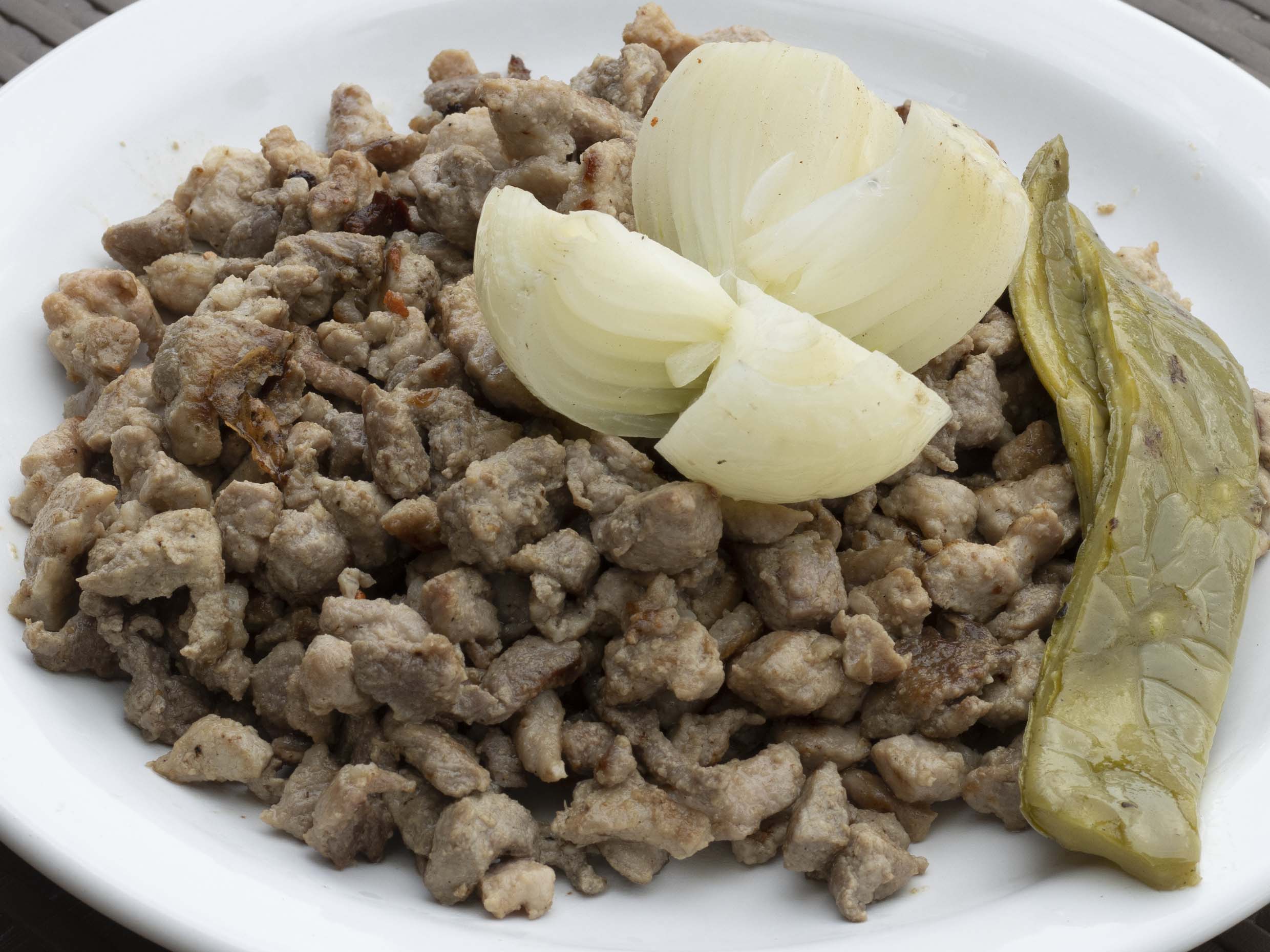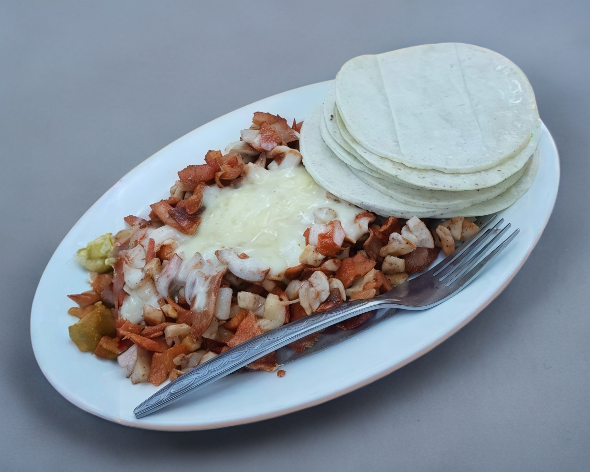 Chorizo, chuleta, cebolla y jalapeño.