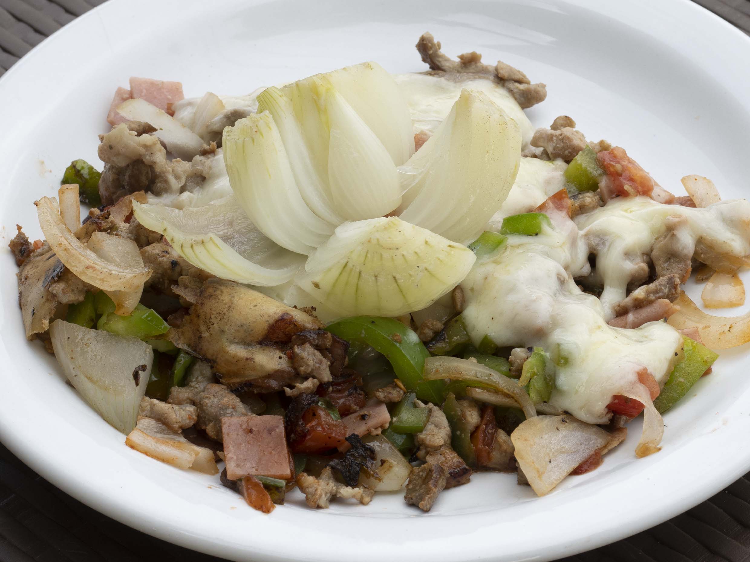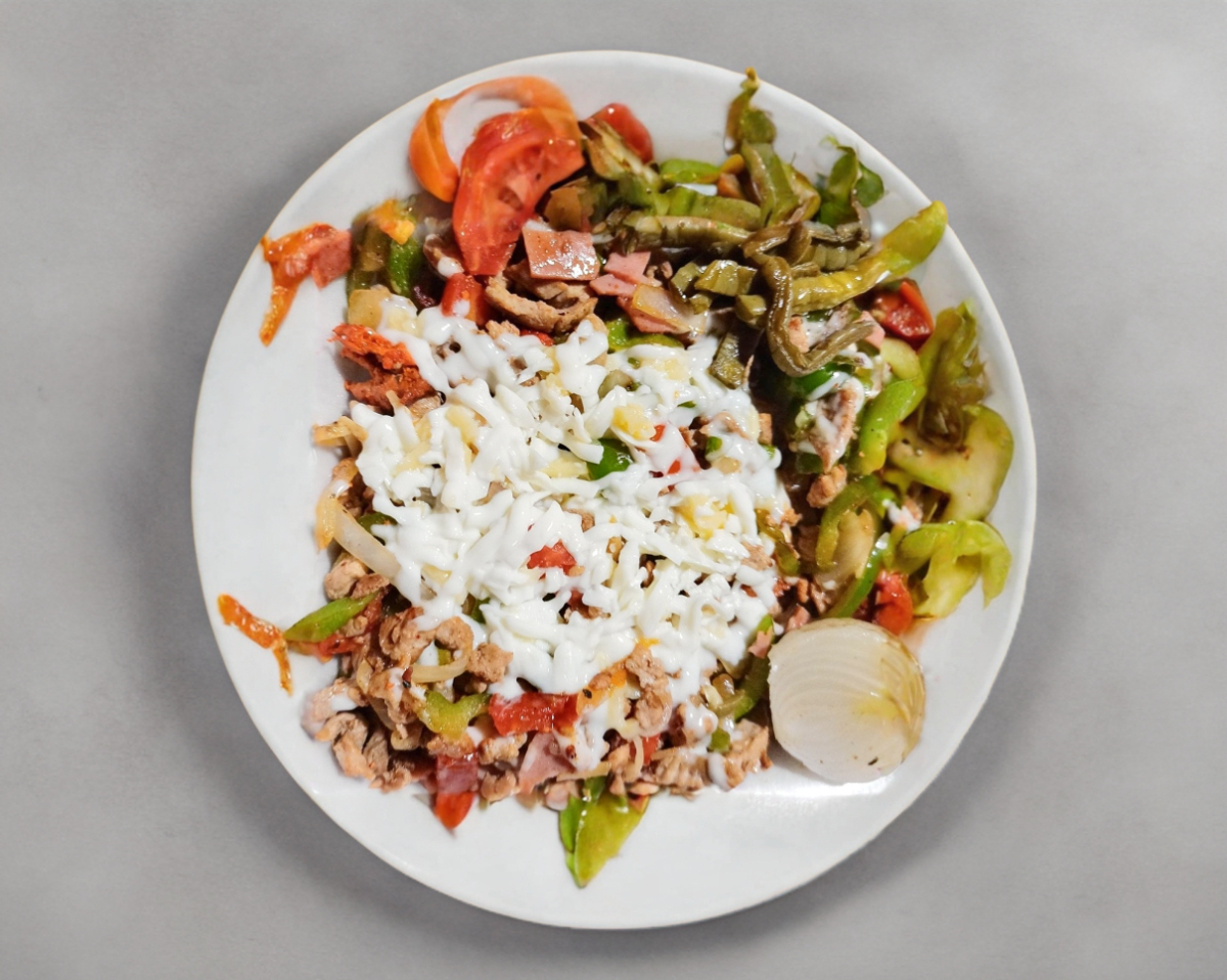 Chuleta, jamón, tocino, morrón, cebolla, jitomate y queso.