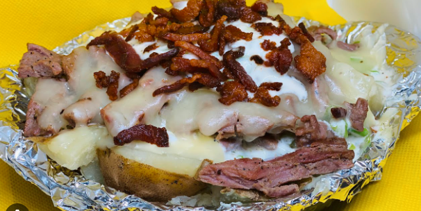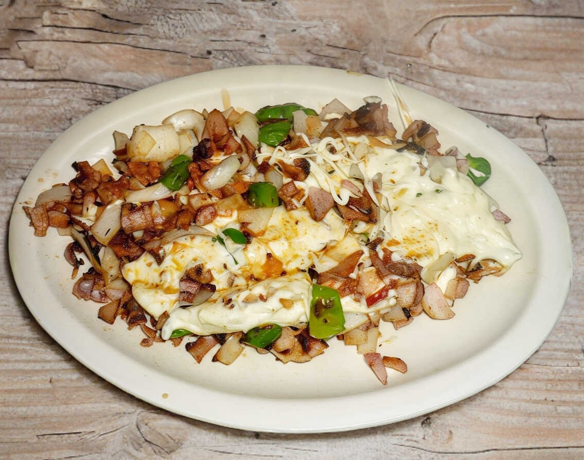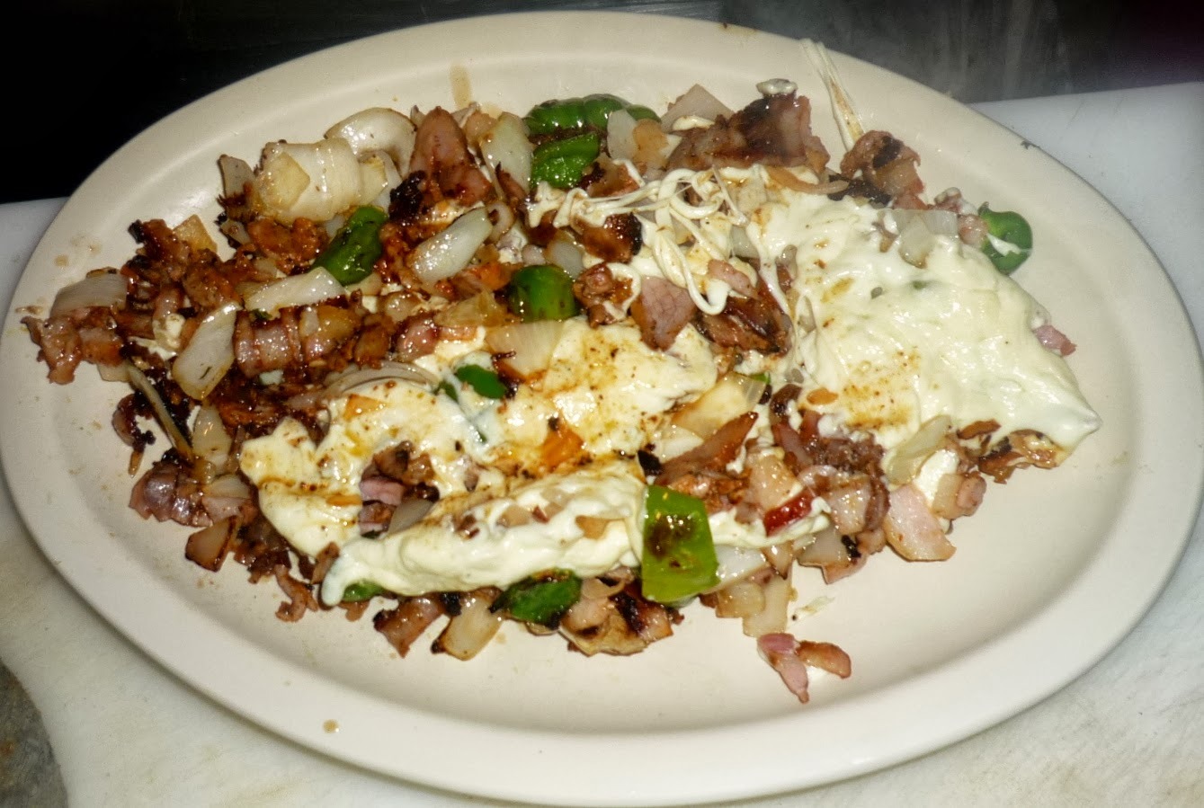 Bistec, costilla, tocino, cebolla, pimiento, jitomate y queso.